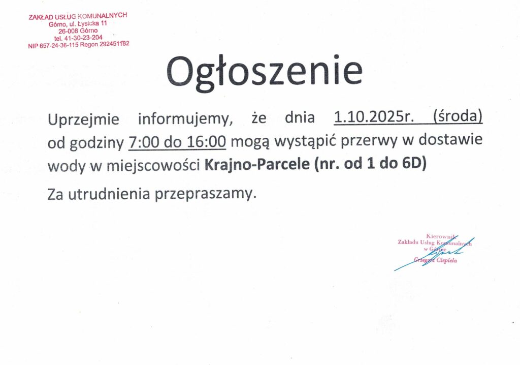 Ogłoszenie – Możliwe przerwy w dostawie wody w dniach 1.10.25r w miejscowości Krajno-Parcele 26 września, 2025 | No Comments | ogłoszenie
