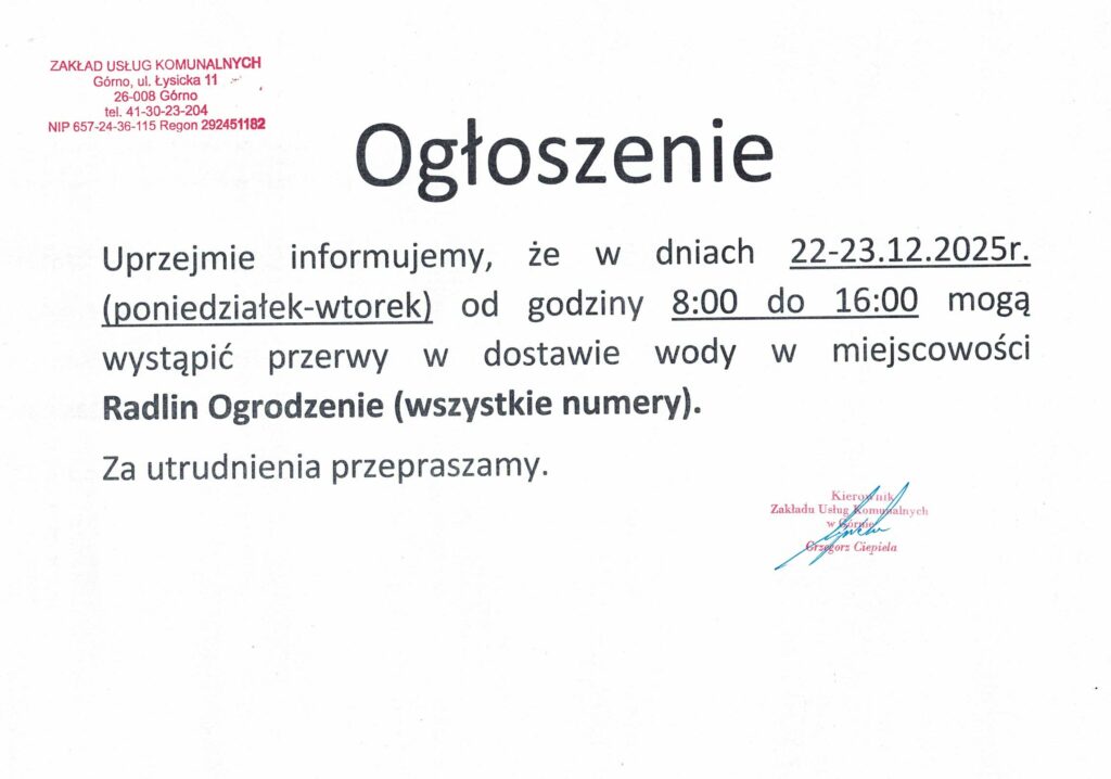 Ogłoszenie – Możliwe przerwy w dostawie wody w dniach 22-23.12.25r w miejscowości Radlin Ogrodzenie 17 grudnia, 2025 | No Comments | ogłoszenie, top