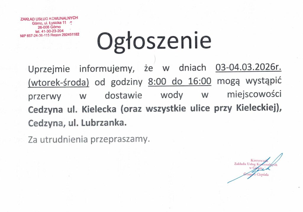 Ogłoszenie – Możliwe przerwy w dostawie wody w dniach 3-4.03.26r w miejscowości Cedzyna 23 lutego, 2026 | No Comments | ogłoszenie, top