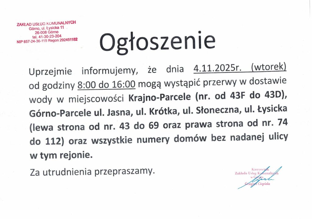 Ogłoszenie – Możliwe przerwy w dostawie wody dnia 4.11.25r w miejscowości Krajno-Parcele i Górno-Parcele 29 października, 2025 | No Comments | ogłoszenie, top