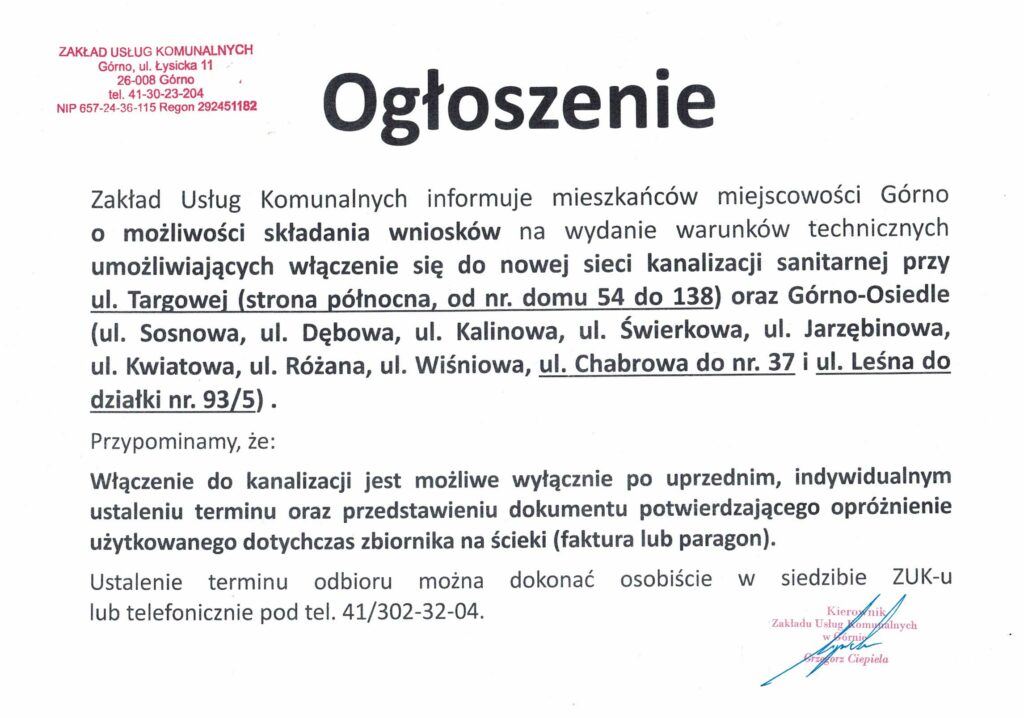Ogłoszenie – możliwość składania wniosków na wydanie warunków technicznych umożliwiających podłączenie się do sieci kanalizacyjnej w miejscowości Górno, ul. Targowa i Górno-Osiedle 20 kwietnia, 2026 | No Comments | news, ogłoszenie